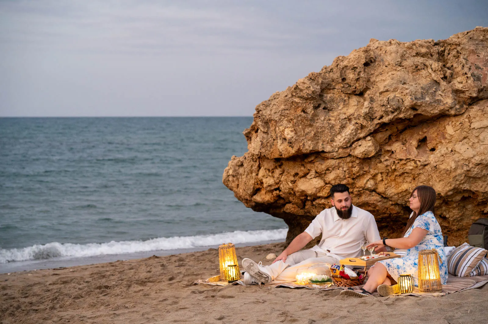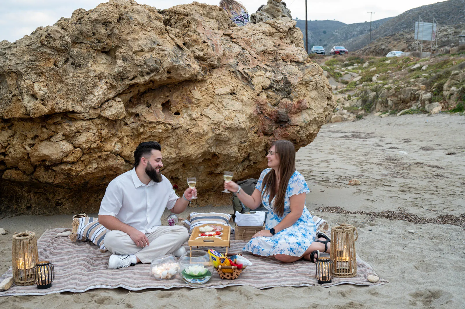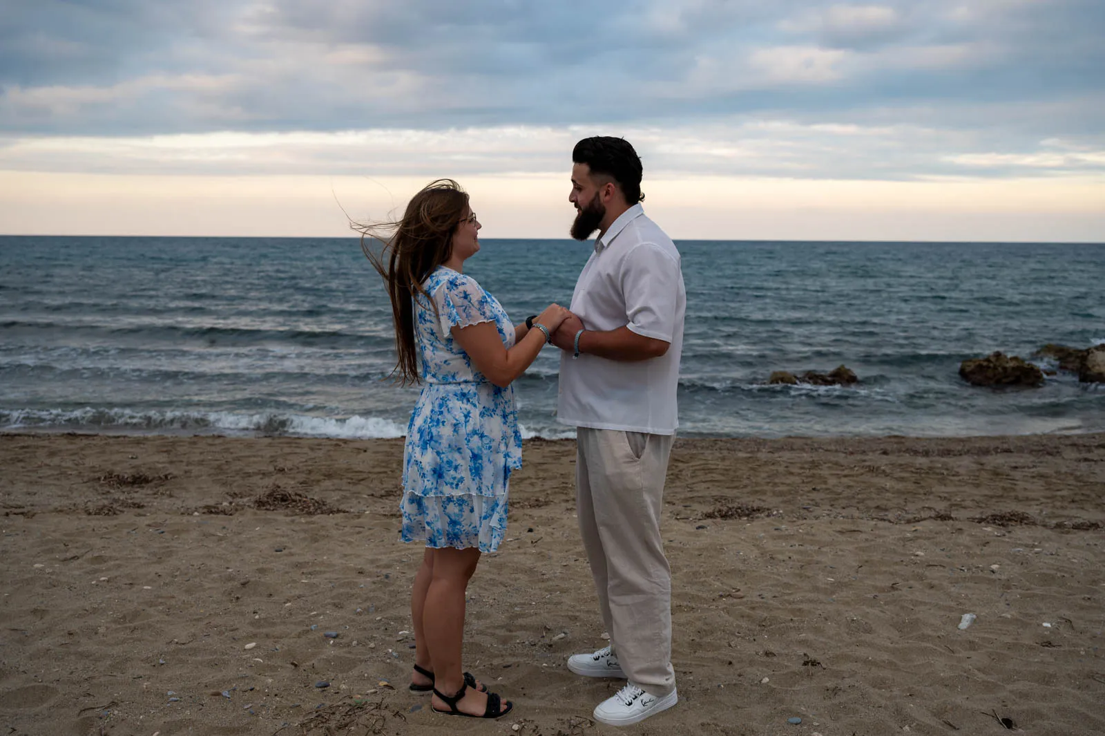 A romantic seaside proposal on the peaceful shore of Petres Beach, near Rethymno, Crete.