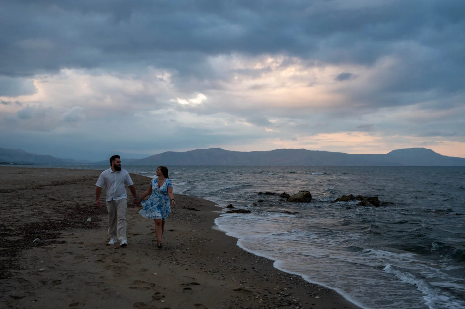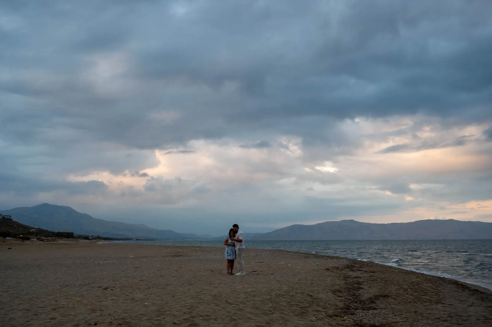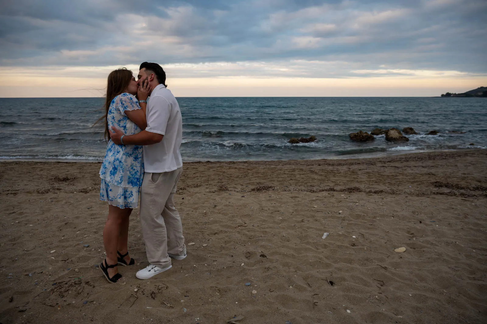 Petres Beach was chosen for its calm atmosphere and open horizon — a place where nothing distracts from the moment itself. As the sun slowly lowered, Leon led Sandra to the shoreline, letting the scene unfold naturally.
