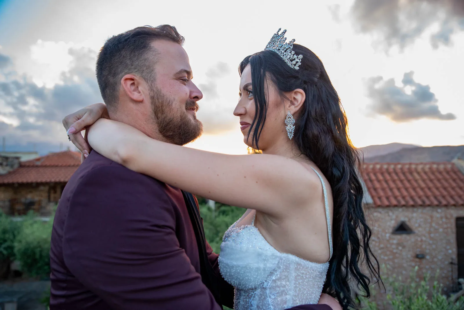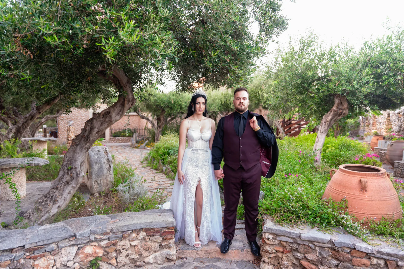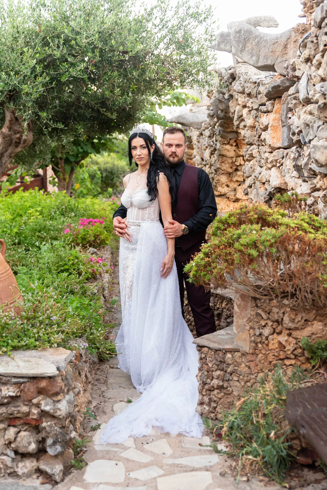 Stone paths, warm textures, and the kind of Cretan sunset that wraps gently around a couple instead of overwhelming them.