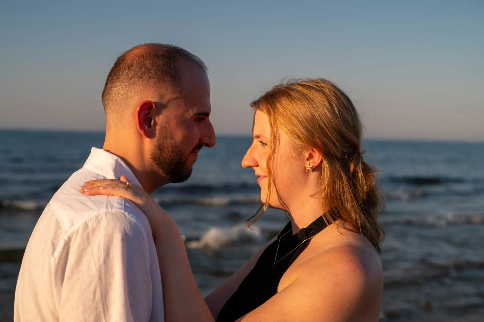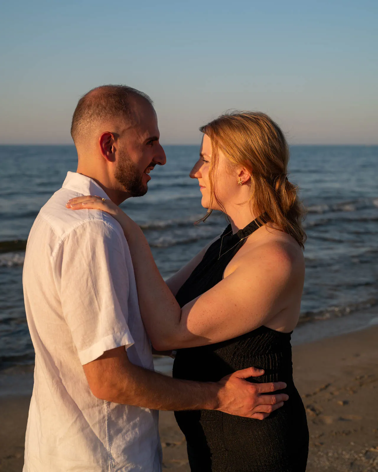 The session continued naturally, with relaxed photographs along the shoreline as the sky faded into evening tones. Nothing was forced. Nothing was rushed. Just two people, a sunset, and the beginning of a new story.