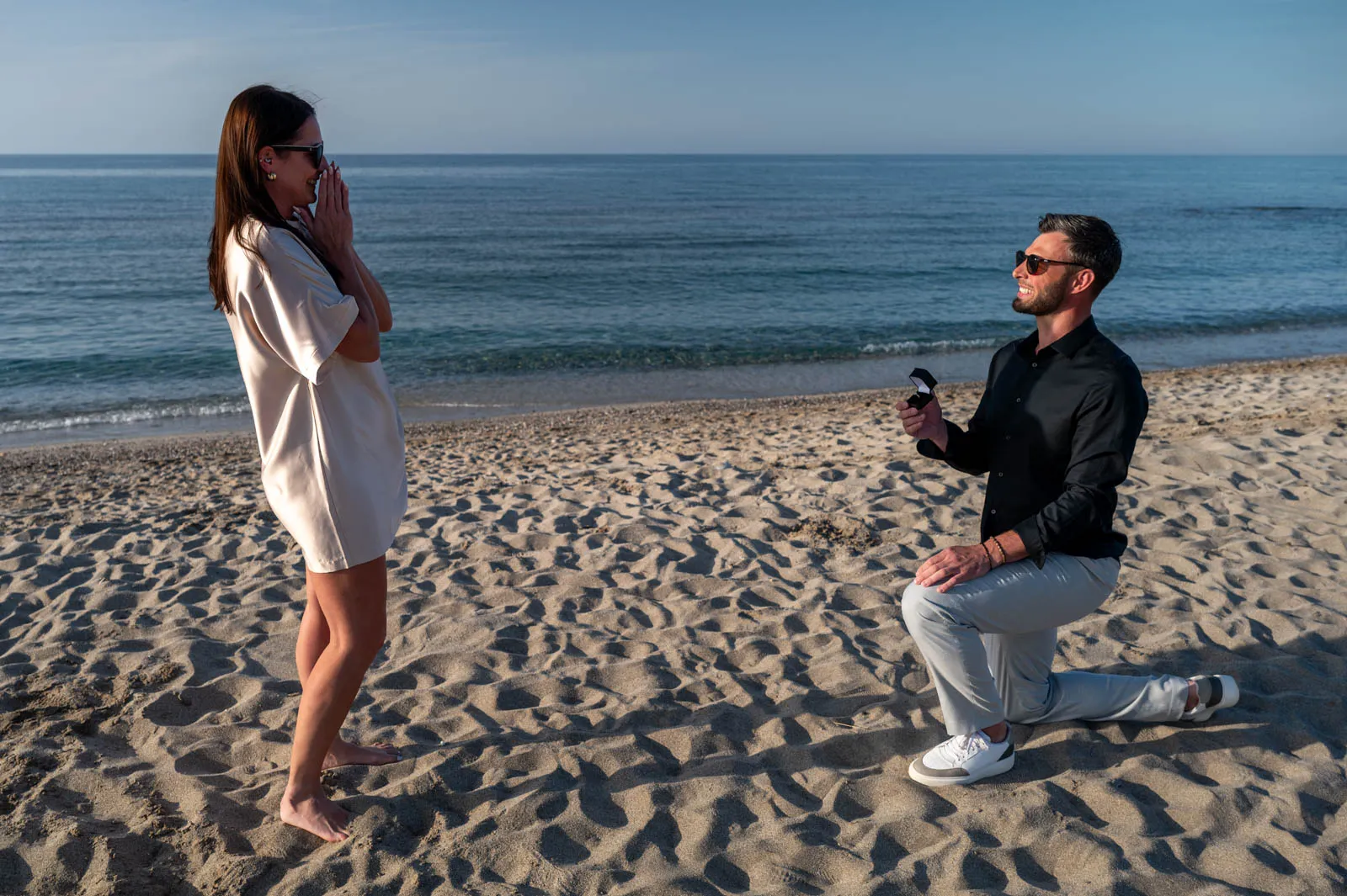 With only the sound of the waves and the open horizon ahead of them, the moment unfolded naturally — no distractions, no rush, just a sunset, the sand beneath their feet, and a heartfelt “yes” carried by the evening breeze.
