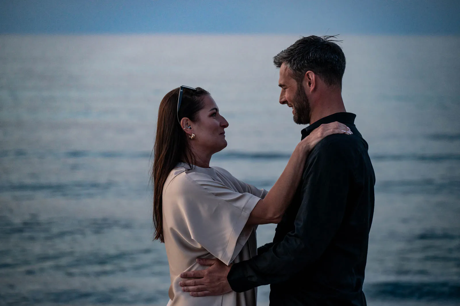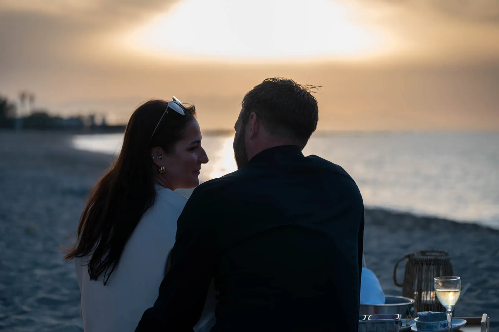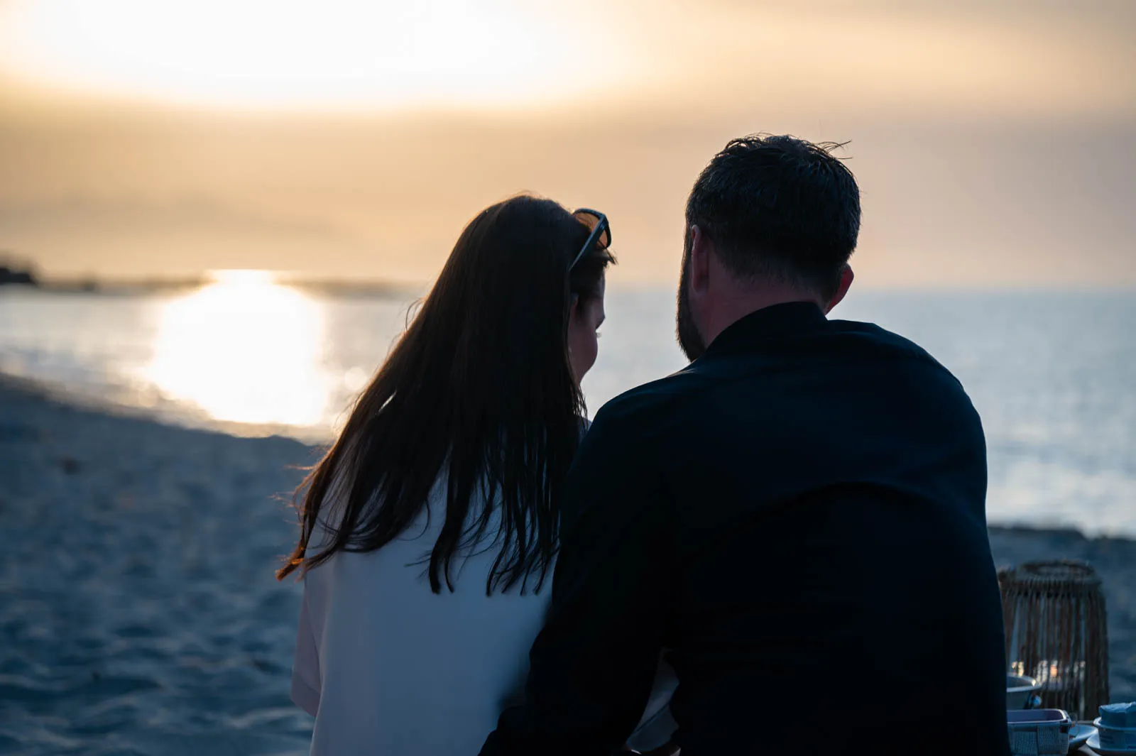 Aposelemis Beach offered the perfect setting for a proposal that felt calm and deeply personal. As the sun began to lower and the sea reflected warm shades of gold and soft blue, Nathan chose this quiet stretch of coastline to ask Emma the question that would change their story.