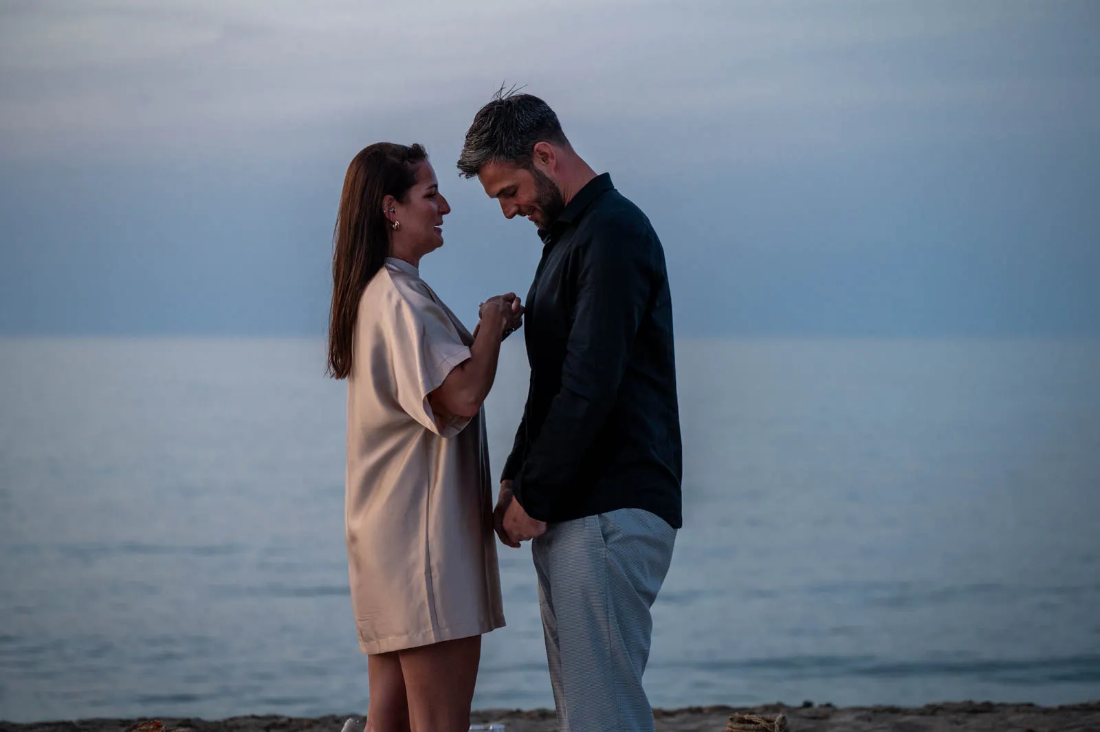 Nathan wanted the proposal to feel effortless — just the two of them, a quiet beach, and the right moment. Aposelemis Beach was the perfect choice: open space, soft sand, and a sunset that slowly transforms the horizon into warm, muted tones.